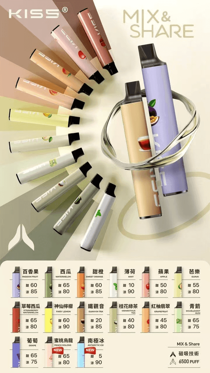 KIS5 MIX & SHARE 是 KIS5 推出的創新型一次性電子煙,最大賣點在於專屬的「MIX & SHARE」混搭功能,可同時裝入兩顆不同口味的煙彈,讓用戶自由組合出高達78種獨一無二的風味配方,滿足追求新鮮感與個人化體驗的玩家。